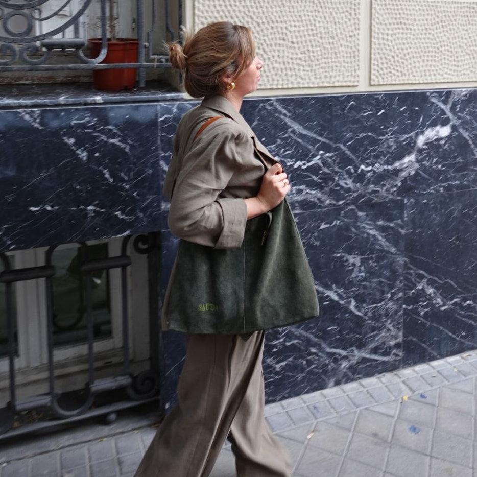 Bolso formato shopper de ante. Asa de hombro. Monedero interior con cremallera, unido con cadena metalizada