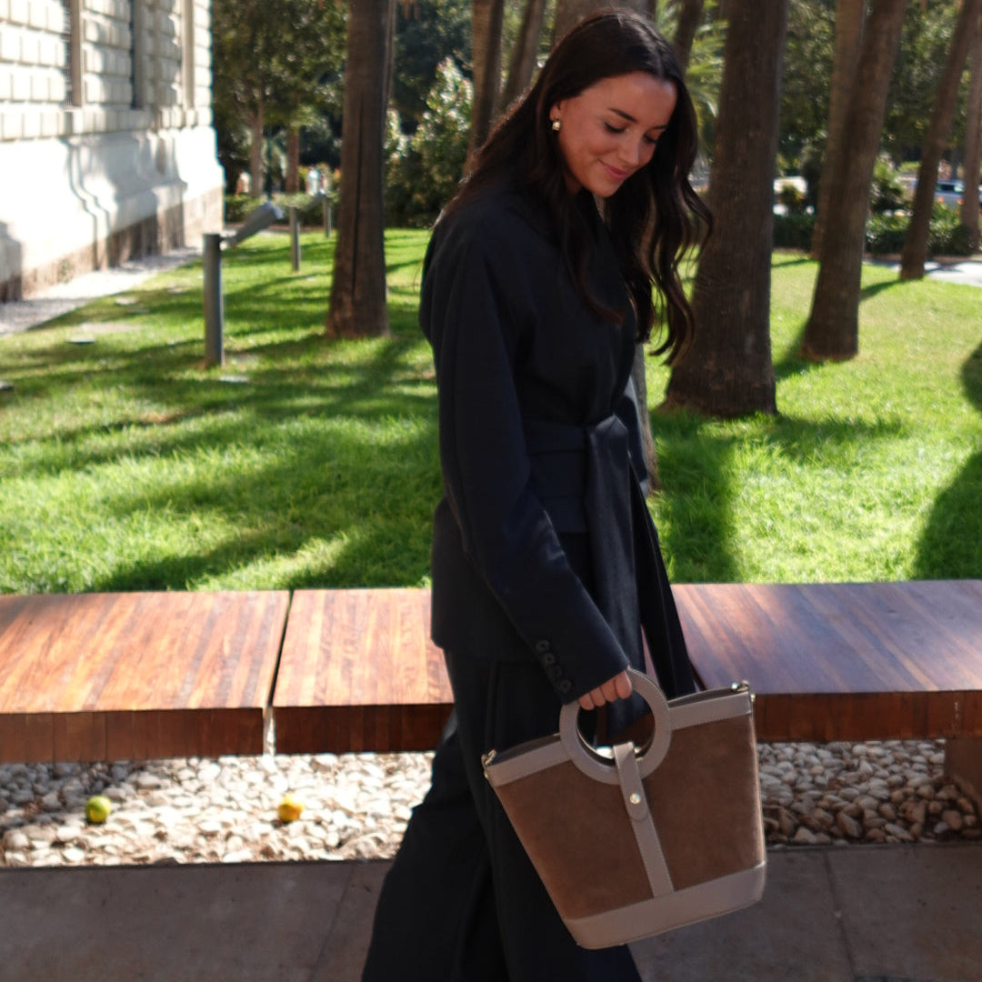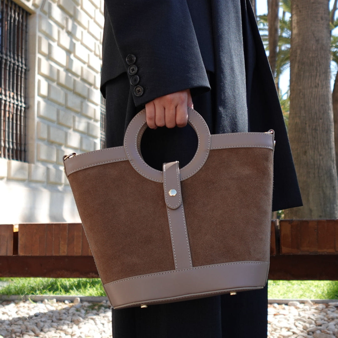 Bolso de mano con diseño estructurado, confeccionado en una combinación de ante y cuero. Dispone de doble asa: una asa circular principal para llevar en la mano y otra asa adicional para colgar al hombro. Incluye un bolsillo interior con cierre de cremallera.