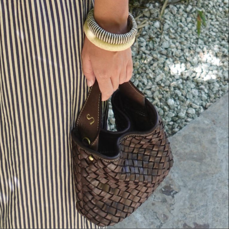 Bolso de mano confeccionado en piel trenzada. Contiene bandolera estraible para colgar. Detalle de logo bordado a contraste en el asa.